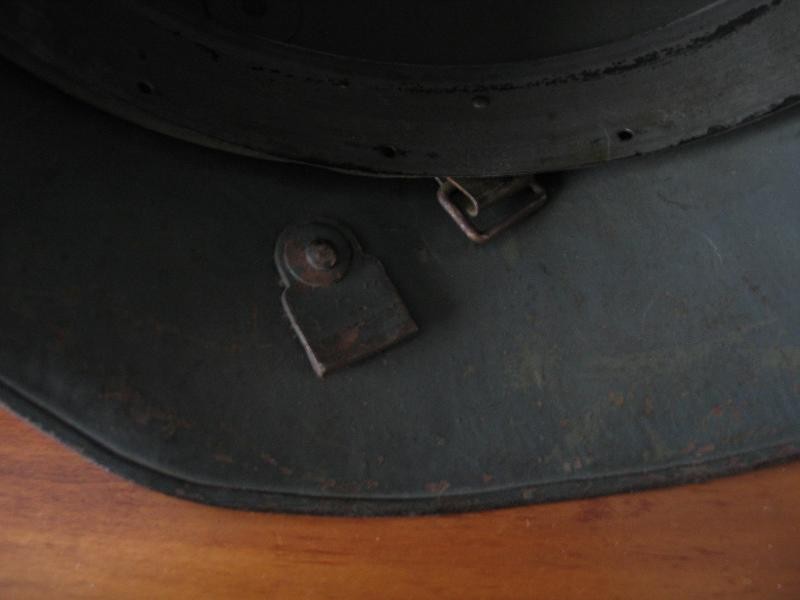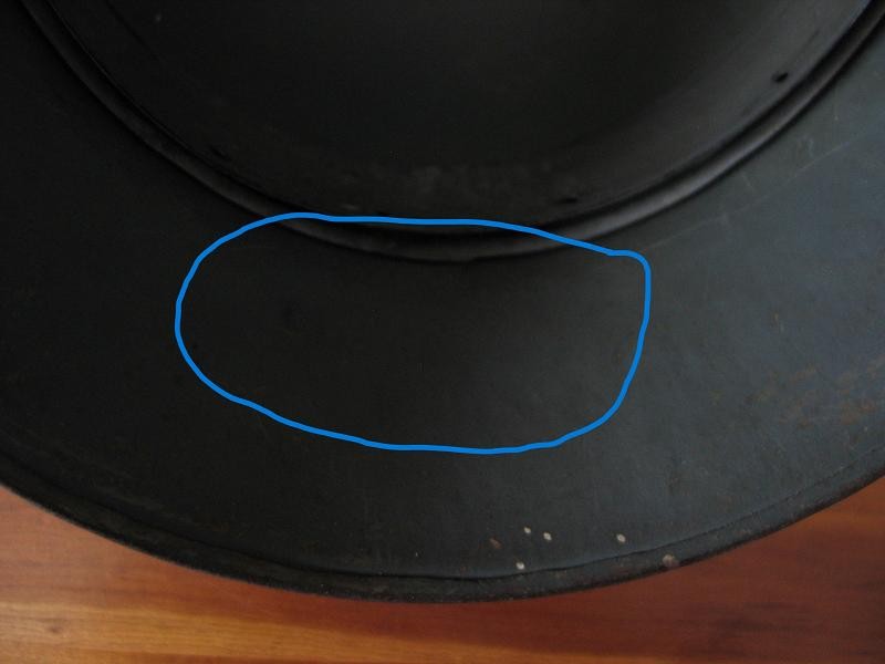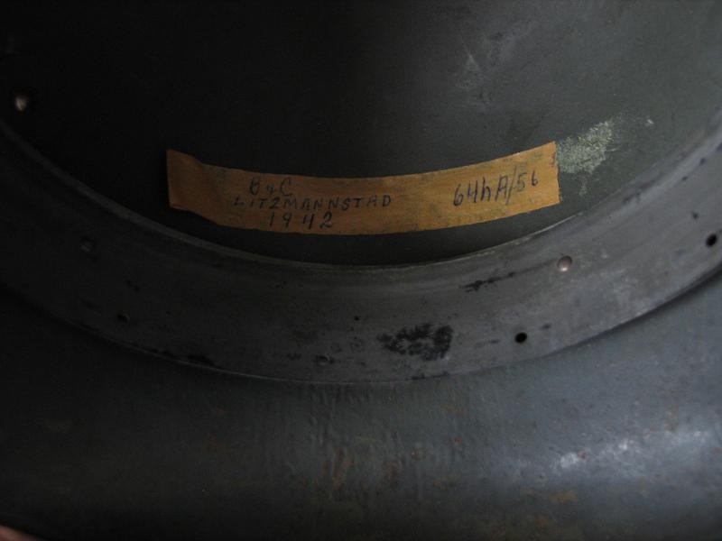 M17 Austrian/German Rural Gendarmerie Paramilitary Police Helmet. The helmet is missing the liner and chinstrap. Otherwise it is in very good condition. On masking tape affixed to inside front brim is the nomenclature. B&C LITZMANNSTAD 1942 64hA/56. I searched LITZMANNSTAD 1942 and was able to put a possible city name LODZ to the translation. This was a Polish city with a large Jewish population annexed by the Germans in 1942. The helmet also appears to be named to an individual on the inside back rim. I've circled the area. The name is visible but hard to read.
